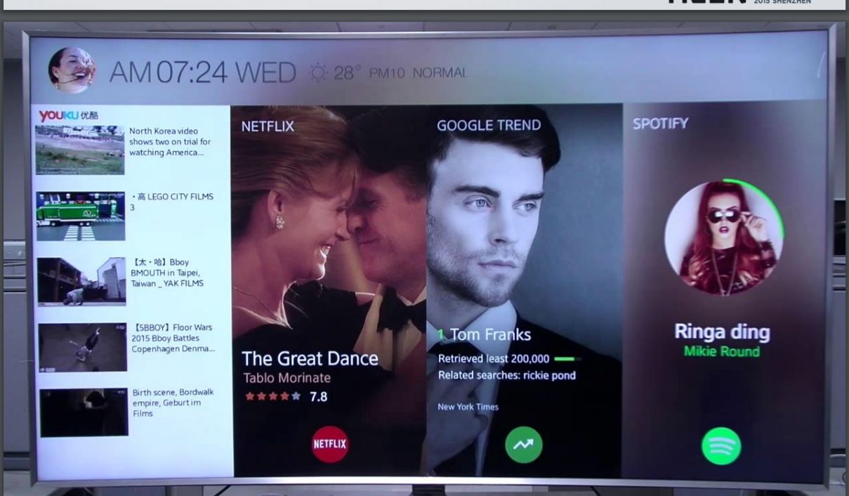 Screenshot of DALi 2D/3D engine running on a Samsung TV within Node.JS. DALi is written in C++ and uses a dedicated render thread, so any kind of garbage collection that takes places on the main thread used by Node.JS doesn't effect rendering performance. A lot of magic was done to allow DALi and it's Wayland adaptor ( Window Manager) to run on top of Node.JS with its LibUV main loop.