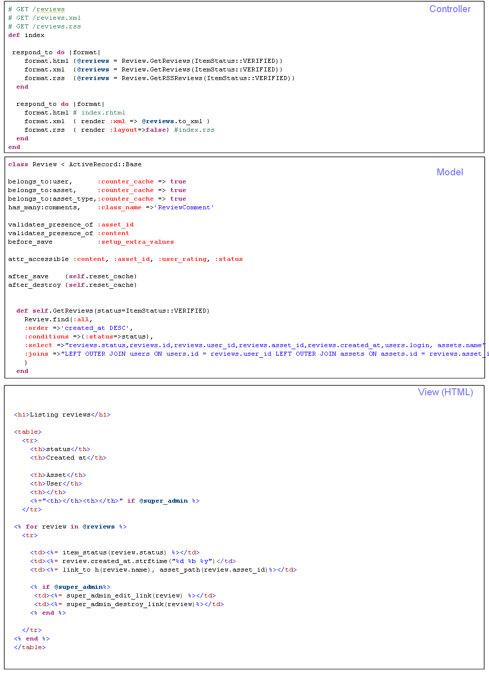 Using REST principles the site has a number of resources: users, assets (films), ratings, reviews etc. Below is some of the code for reviews. Note that the resource can be rendered in HTML,XML and RSS.