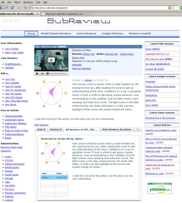 SubReview is Web 2.0 site and used some leading edge technology at the time such as Ruby on Rails v2, Adobe Flex and OpenID. Currently needs an overhaul to remove Adobe Flex and YUI dependencies.