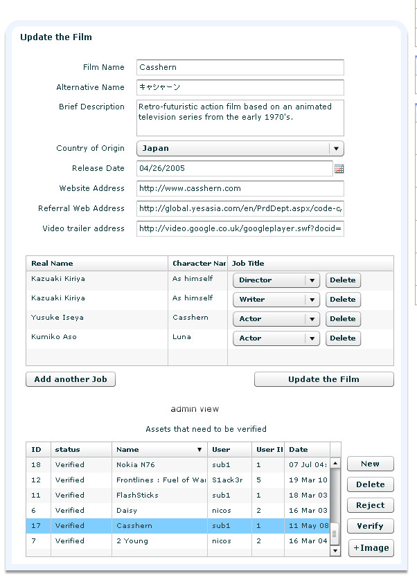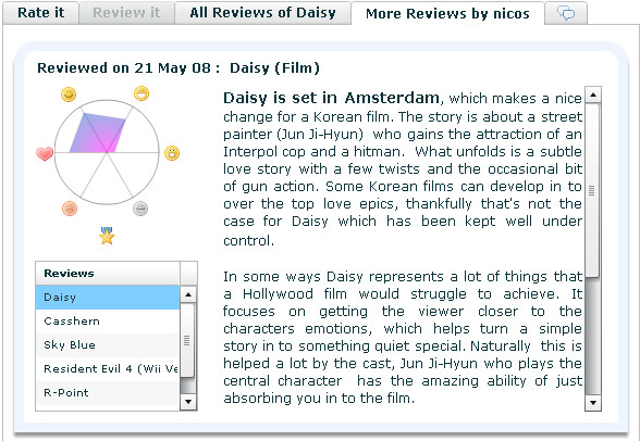 This is the control panel for creating reviews, comments, and looking at all the reviews of a particular film (or from a particular user) without having to reload the page. Once again the data transfer take places using XML. The rating control, is a custom Flex control so that it can be re-used in other places.