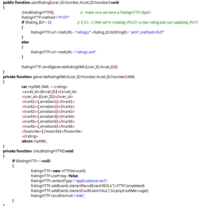 The custom component displays a 6-axis graph and has the ability to get and put a rating value. The code below shows how easy it is to get Flex to update/create a new rating for an asset(film) on the server using XML. You can see why Adobe describes the combination of Flex + Rails + Ruby as Rich Internet Application Nirvana.