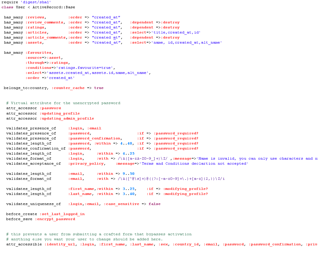 The user model stores encrypted passwords and supports OpenID (via the OpenIdAuthentication gem).
